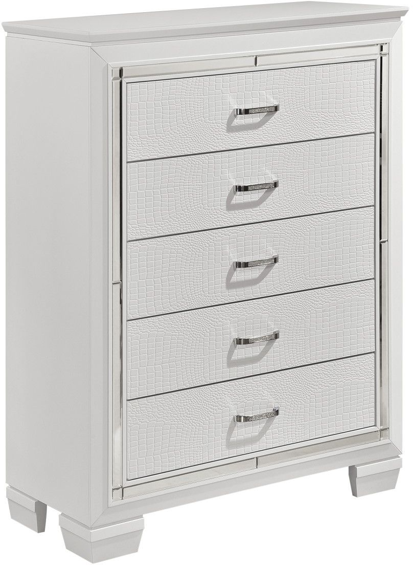 Glamour reigns in the design of the Allura Collection. Framing each piece is a decorative beveled mirror accent that enhances the illumination from the touch-engaged LED back-light of the headboard and mirror, as well as the under-light of the night stand. Alligator embossing and high polished crystal-enhanced hardware boldly accent the black finish as does the pearl-black bi-cast vinyl crystal-tufted headboard insert of the collection. The Allura Collection is also offered in Silver, Gray, and white.Read More