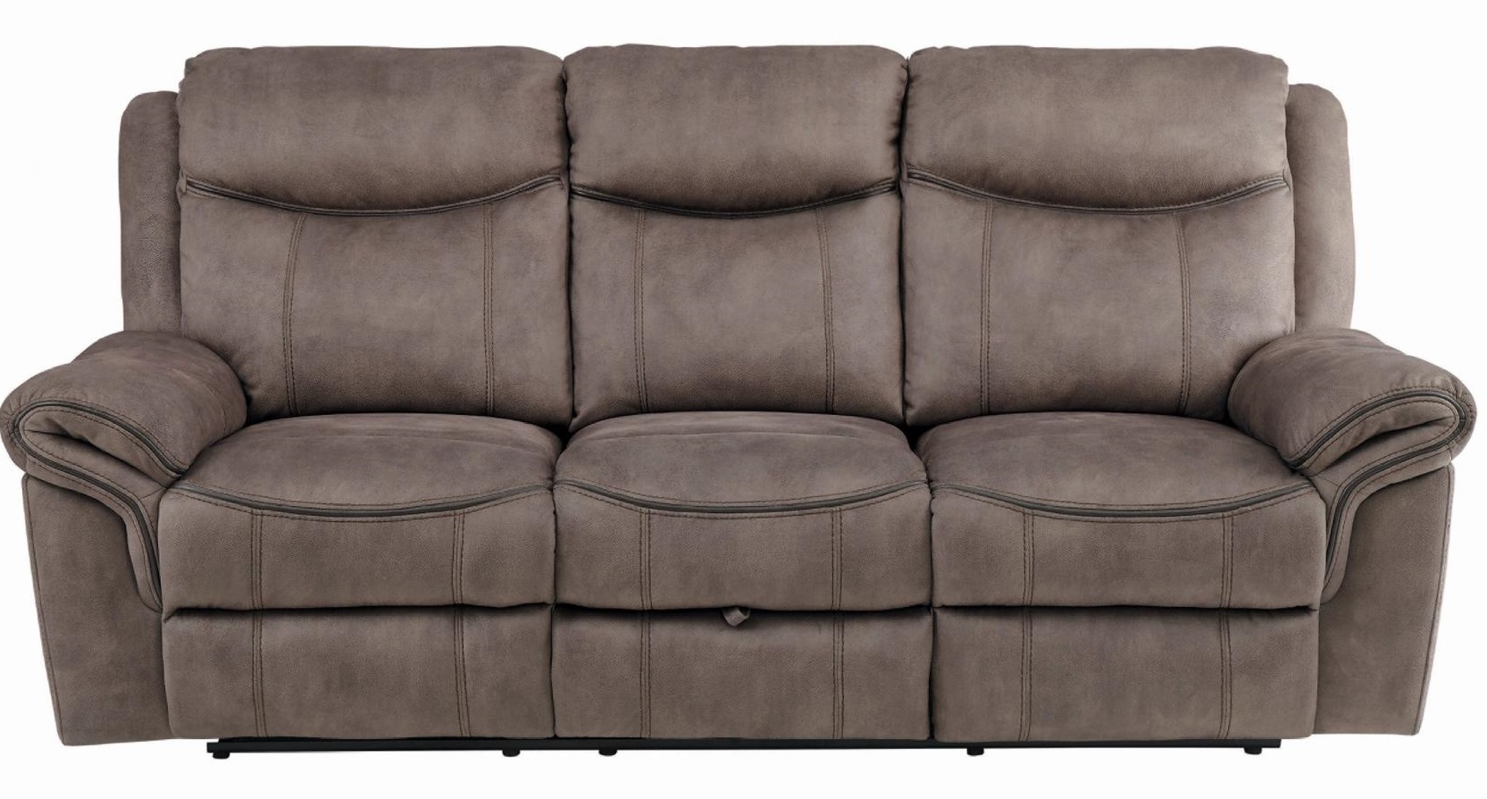 The seating group is offered in a brown fabric or dark brown Aire Hyde for comfort and style that will blend effortlessly with your transitional decorative preference. Manual motion mechanisms operate with the pull of a side-mounted tab, that once engaged, take you from seated to reclined in an easy motion. Each piece in the collection has an individual function allowing for convenience and comfort. The sofa features dual reclining ends and a drop down center seat back with cup-holders, electric receptacles, USB port and tabletop space, the dual glider reclining ends of the Loveseat flank a center mounted console with storage, electric receptacles and cup-holders, and the reclining chair features a glider mechanism that allows for easy back and forth motion.