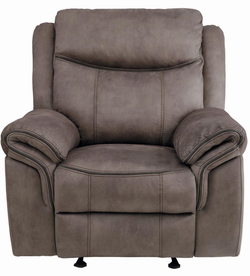 Reclining chair features a glider mechanism that allows for easy back and forth motion.