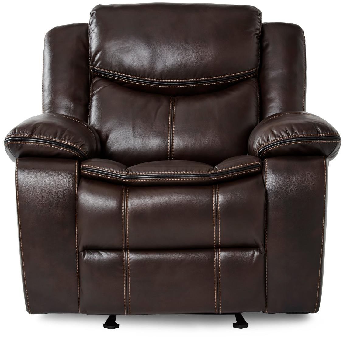 The two optional coverings – black or brown leather gel match – feature contrast welting for definition of profile and modern accenting. Manually engaged motion mechanisms allow for quick transition from seated to prone with the quick pull of a tab. Each piece in the collection has an individual function allowing for convenience and comfort. The sofa features dual reclining ends, the dual glider reclining ends of the Loveseat flank a center mounted console with storage and cup-holders, and the chair features a glider mechanism that allows for easy back and forth motion. The sectional configuration features a left side loveseat with reclining end and the right side double reclining loveseat with center console unit featuring cup holders and storage.