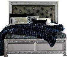 Acrylic crystals frame the Eastern King bed, reflecting the light to create eye-catching drama. The silver finish serves as the perfect complement to the medallion accents. Providing contrast to finish is the dark gray faux leather, button-tufted headboard panel.Read More