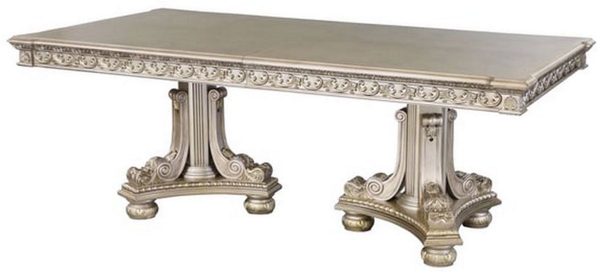 Traditional design elements reign at every turn – egg and dart molding, acanthus leaf carving, bead molding, gold tipping and extravagant carvings – creating a sophisticated look for your dining room. A traditional platinum gold finish is utilized to highlight the oak veneer and subtle decorative inlay pattern found on the dining table’s top.Read More