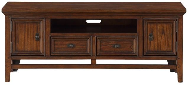 With a subtle lodge look that takes inspiration in design history, the classic styling of the Frazier Park Collection will help you create a living room environment that is a reflection of your preference for traditional spaces. The brown cherry finish that highlights the mindy veneer provides rich character to the wood’s grain. Horizontal fixed knob hardware fronts the functional drawers and doors of the 59-inch TV stand, creating subtle contrast the collection’s finish. Open media storage on the console provides convenient, functional access to your openly displayed items. 81-inch TV stand and side piers are also available.