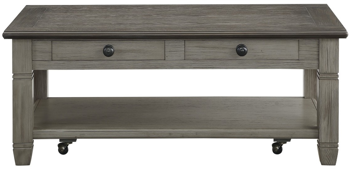Inspired by the aesthetic of a casual country home and providing functional decorative accent for your living room is the occasional table set of the Granby Collection. The two-tone look of the acacia and pine solids base, finished in antique gray, and the oak veneer of the cocktail table’s coffee-finished top, presents as a harmonious combination of colour, perfect for your home. Dark finished metal knob hardware fronts the functional drawers of the cocktail table while providing subtle contrast to the finish of the collection. An open display shelf creates a perfect spot for display of your decorative accessories, while casters allow for ease of movement of the cocktail table within your space.
