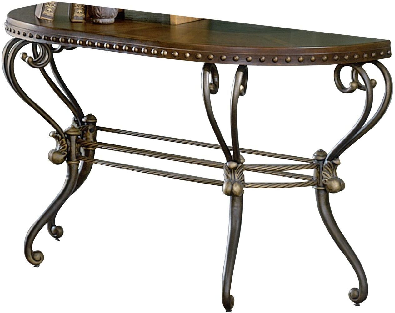 The Jenkins Collection occasional group shows a strong personality with the look of a leather edge banding and etched center motif. Featuring curved metal base and a warm tobacco finish.Read More