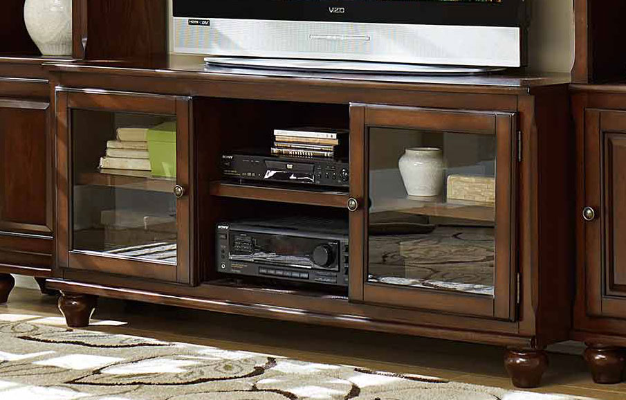 Designed to serve as the focal point of your entertainment room, the Lenore Collection will provide a functional and stylish platform to display your TV, decorative accents and media consoles. Transitional accents such as bun feet, metal knob hardware and a rich cherry finish lend to the classic look. A lighted bridge highlights the display shelf, each providing support to join the two side unit bookcases. Glass and solid door storage, along with the shelving of the bookcases, provides ample storage for your display accents.Read More