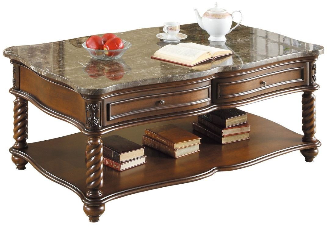 Serpentine lines form the boxed table tops: each crowned with elegant marble and edged with short grain mahogany border. Furthermore, in mahogany finish wheat sheaf carved accents top spiral turned legs while display shelving is supported by traditional bun feet. These unique and graceful features make the Lockwood Collection a perfect addition to your living room.Read More