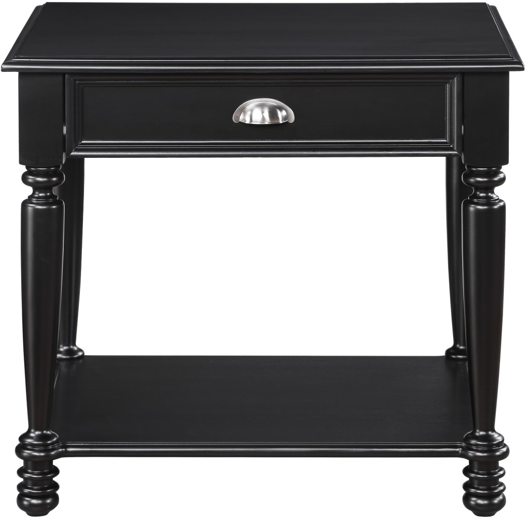 Providing decorative function to your casual traditional living room is the Sanders Collection. The end table has a black finish with traditional accenting of turned legs, cup hardware, display shelf and functional drawer that lend to the classic design.